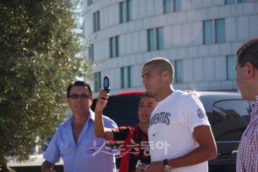 유벤투스 트레제게(오른쪽에서 두 번째)가 훈련을 위해 숙소를 나서다 팬들에게 붙잡혀 휴대폰 카메라 촬영에 응하고 있다.