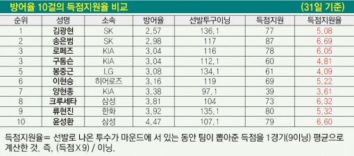 그렇다면 득점지원율로 본 방어율 10걸의 희비는 어떨까.