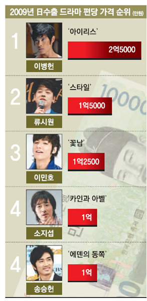 1위는 역시 이름값을 톡톡히 하는 이병헌. 드라마 ‘아름다운 날들’과 ‘올인’으로 한류스타로 떠오른 이병헌은 5년 만에 드라마 ‘아이리스’로 돌아왔다. 200억 원의 제작비가 투입된 ‘아이리스’는 이병헌이 출연한다는 이유만으로 일본에 50억 원에 팔렸다. 20부작 기준으로 편당 2억5000만원 수준. 하지만 일본에는 24편으로 편집해 수출하기 때문에 따져보면 2억 800만 원이다.