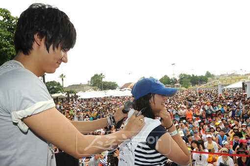 ‘꽃남’ 이민호가 3일 경기도 용인 에버랜드 캐리비안 베이에서 펼쳐진 ‘햅틱 아몰레드 페스티벌’에서 여성 팬들과 함께 햅틱 댄스를 추고, 등에 티셔츠를 올린 채 사인(사진)해주는 등 즐거운 한 때를 보냈다.