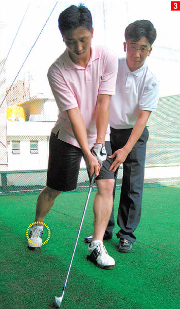 원활한 체중 이동을 위해서는 사진○1처럼 좌측 무릎과 엉덩이가 스윙을 주도하며 타깃 방향으로 이동해야 한다. 그래야 왼쪽 무릎과 오른쪽 무릎의 간격이 넓어져 안정된 스윙 자세를 만들 수 있다.
