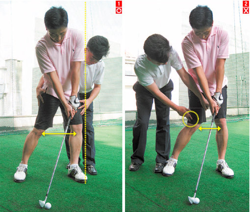 사진○2처럼 왼쪽 무릎과 오른쪽 무릎의 간격이 좁고, 임팩트 순간 한쪽 무릎이 구부러진 자세는 볼에 효과적으로 파워를 전달할 수 없다.