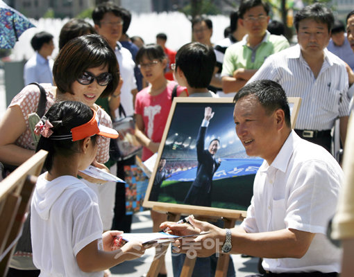 이날 행사의 하이라이트는 즉석 팬 사인회. 사진찍기 바쁘던 시민들은 펜을 들고 너도나도 사인을 요청했고, 허 감독은 한 장 한 장 정성스레 사인을 해주기 시작했다. 어린 팬에게는 머리를 쓰다듬으며 “꼭 훌륭한 사람이 돼라”는 따스한 격려도 했다. 협회 관계자들은 예상치 못했던 상황에 다급히 의자를 공수했지만 파라솔을 구하지 못해 허 감독은 20여 분간 뙤약볕을 맞으며 땀을 흘려야 했다.