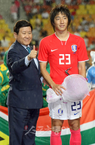 홍명보 감독이 이끄는 20세 이하 청소년 축구대표팀에는 2005년의 박주영(24·AS모나코)과 같은 특출한 스타가 없다. 국제축구연맹(FIFA) U-20 청소년월드컵 최종멤버가 아직 확정된 건 아니지만 이번 수원컵 명단에도 프로 선수가 9명으로 그리 많지 않다. 한국축구가 낳은 세계적인 수비수 홍명보 감독이 지휘봉을 잡고 있으면서도 상대적으로 언론과 팬들의 조명을 덜 받고 있는 이유기도 하다.그러나 홍명보호에는 조영철(20·알비렉스 니가타·사진)이 있었다. 조영철은 6일 오후 수원월드컵경기장에서 벌어진 일본과의 대회 조별리그 3차전에서 전반 28분 이승렬의 결승골을 도우며 2-1 승을 이끌었다. 조영철은 남아프리카공화국과의 1차전 1골을 포함해 이번 대회 1골 1도움으로 최우수선수(MVP)에 뽑혔다. 한국은 1차전 남아공 4-0, 2차전 이집트 1-0 승리에 이어 3연승으로 2003년과 2005년 이후 3번째로 우승컵을 들어올렸다. 일본과의 역대 전적도 25승7무5패의 압도적인 우위를 지켰다.