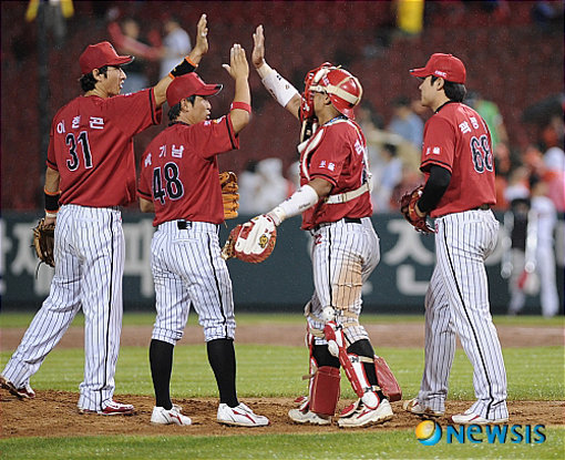 ![6일 오후 프로야구 LG 트윈스와 기아 타이거즈의 경기가 열린 잠실야구장에서 7연승을 거둔 기아 선수들이 경기 후 하이파이브를 하고 있다. [뉴시스]](https://dimg.donga.com/wps/SPORTS/IMAGE/2009/08/06/22214725.1.jpg)