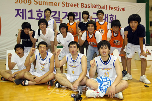강원도의 생활체육 농구클럽 ‘HOT’는 ‘2009 킹 오브 더 3on3’에서 유일하게 중등부, 고등부, 대학·일반부에 모두 대표팀을 내보낸 명문 동호회다. ‘HOT’를 이끌어가는 이상현 회장(사진 아랫줄 왼쪽에서 세 번째)과 팀원들이 대회 전 기념촬영을 하며 선전을 다짐하고 있다. 김종원 기자 won@donga,com