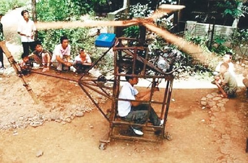 이 헬리콥터의 몸체는 쇠파이프로 뼈대를 만들었고 프로펠러는 느티나무로 만들고 오토바이 엔진을 이용하였다고 한다. 우리나라 돈으로 약 200여 만원의 비용이 들어간 이 헬리콥터는 실제로 약 80 0m 상공까지 날 수 있다고 한다.