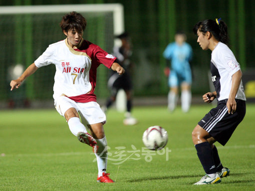 10일 저녁 목포 국제축구센터에서 열린 2009WK-리그 올스타전 중부팀과 남부팀의 경기에서 중부팀 김주희가 크로스를 하고 있다.