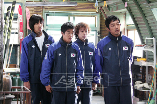 ‘국가대표, 국가대표를 만난다.’영화 ‘국가대표’의 김용화 감독을 비롯해 하정우, 성동일, 김지석 등 배우들이 실제 국가대표 스키점프 선수들을 응원한다.