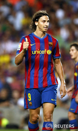 즐라탄 이브라히모비치가 1일(한국시간) 스페인 바르셀로나 누캄프에서 열린 2009-2010 시즌 프리메라리가 홈 개막전에서 팀의 세 번째 골을 성공시킨 뒤 기뻐하고 있다.ⓒ로이터, 무단전재 및 재배포 금지