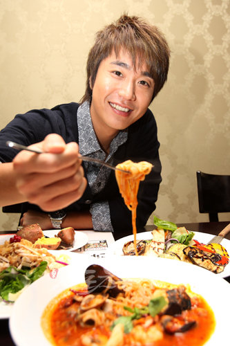 스파게티와 먹물피자 등 음식을 잔뜩 시켜놓고는 그저 먹기를 권유할 뿐이었다. 조성모는 ‘출발! 드림팀’을 이끌기 위해 체중 조절을 하고 있었다. 임진환 기자 photolim@donga.com
