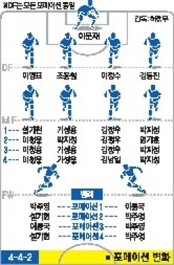 ○새로운 투톱= 공격진의 다양한 조합이 인상적이었다. 측면 날개로 활용될 것으로 보인 설기현이 4-4-2 포메이션 투 톱의 한 자리를 차지했다. 설기현은 오른쪽 윙어와 공격수를 번갈아 맡았다.
