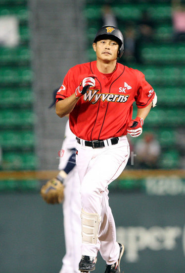 3일 서울 잠실야구장에서 열린 프로야구 두산과 SK의 경기에서 SK 타자 안경현이 6회초 무사 2루때 좌월홈런을 치고 홈으로 돌아오고 있다. 잠실ㅣ 박화용 기자 inphoto@donga.com
