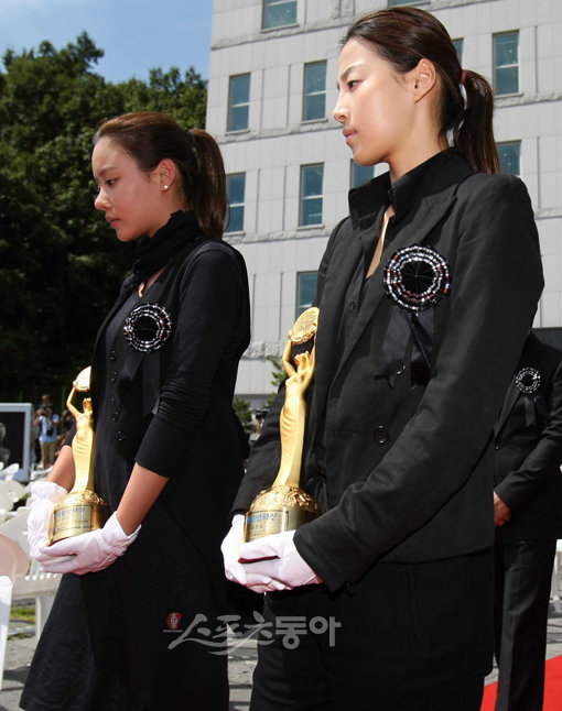 4일 오후 경기도 광주시 분당 스카이캐슬 추모공원에서 열린 故 장진영 추모식에서 고인의 유골함이 추모식장으로 향하고 있는 가운데 배우 김아중과 한지혜가 고인이 생전 수상한 트로피를 들고 뒤를 따르고 있다.