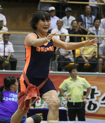결승 상대는 충북의 간판스타 심인숙(33). 박원미는 심인숙에게 목감아치기와 잡채기로 두 판을 따내며 2-1로 생애 첫 우승컵을 품에 안았다. 박원미는 14일 체급에 상관없이 최강의 여장사를 가리는 여자부 대천하장사대회에 출전한다.