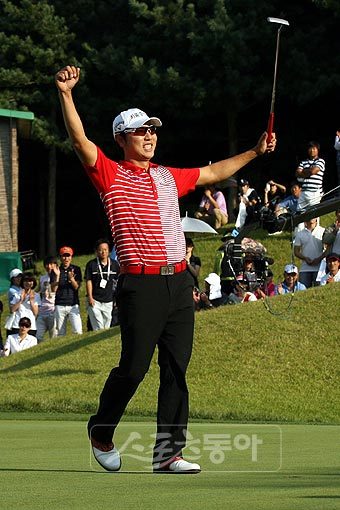배상문이 13일 충남 천안 우정힐스 골프장에서 열린 제52회 코오롱-하나은행 한국오픈 최종 라운드에서 우승을 확정한 뒤 두 팔을 벌려 환호하고 있다. 사진제공 | KPGA