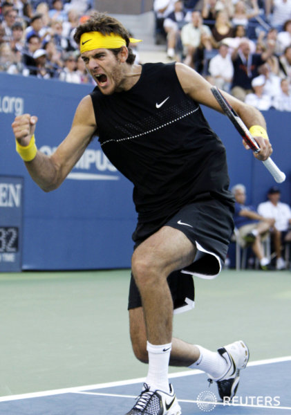 마르틴 델 포트로(아르헨티나)가 15일(한국시간) 뉴욕 빌리진 킹 내셔널 테니스센터에서 열린 US오픈 남자단식 결승전에서 세계랭킹 1위 로저 페더러(스위스)의 대회 6연패와 41연승을 저지한 뒤 포효하고 있다. 뉴욕 | 로이터 연합뉴스