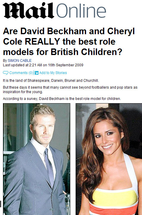 16일(한국시간) 영국 일간지 <데일리 메일>의 보도에 따르면, 미남 축구스타 데이비드 베컴(34.LA갤럭시)과 섹시 팝스타 셰릴 콜(26)이 각각 최고의 남녀 롤모델로 선정됐다.