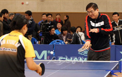 조양호 대한탁구협회장 취임 후 국가대표 팀에 중국을 넘기 위한 다양한 지원책이 마련되고 있다. 조 회장(오른쪽)이 작년 말 불우이웃돕기 자선 탁구 축제에서 김경아와 이벤트 경기를 벌이고 있다. 스포츠동아DB