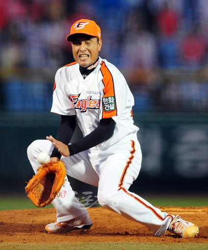 2009 프로야구 한화이글스 대 LG트윈스 경기가 23일 한화 송진우의 은퇴경기로 대전 한밭야구장에서 열렸다. 선발투수로 등판한 송진우가 LG 박용근에 내야 안타를 허용하고 있다. 송진우은 210승 3003이닝 투구라는 대기록을 남기고 21년간의 선수생활을 마감했다. 대전 | 김종원기자 won@donga.com