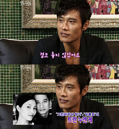이병헌은 지난 23일 방송된 SBS ‘한밤의 TV연예’ 와 인터뷰에서 개봉을 앞둔 영화 ‘나는 비와 함께 간다’에서 여배우 트란 누 엔 케와 함께 한 베드신이 “결코 좋지 않았다” 고 밝혀 눈길을 끌었다.