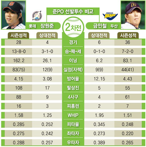 결국 2차전에서는 두산 타자들이 롯데 선발 장원준을 얼마나 효과적으로 공략하느냐가 포인트다. 두산 타자들이 1차전처럼 무기력하다면 올해 준플레이오프는 의외로 싱겁게 막을 내릴 수 있다. 페넌트레이스에서 두산 타선은 장원준에 그다지 강점을 발휘하지 못했다.
