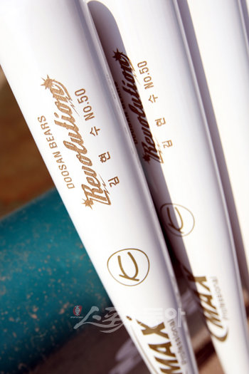 ‘김현수’ 이름이 선명하게 새겨진 방망이가 즐비하다. 방망이가 많아야 잘 친다는 그의 생각 때문에 인라 경기 전 6자루를 준비했고 특별히 두자루를 더 공수받았다. 잠실|박화용 기자 inphoto@donga.com