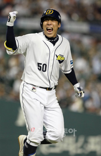 ‘이틀 연속 짜릿한 홈런쇼.’ 두산 김현수가 30일 잠실 준플레이오프 2차전 4-0으로 앞선 5회말 1사에서 오른쪽 담장을 넘기는 솔로 홈런을 날린 뒤 환호하고 있다. 김현수는 1차전과 2차전 이틀 연속 홈런을 기록하며 관중들을 열광시켰다. 잠실|김종원 기자 won@donga.com