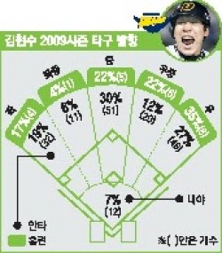 김재현은 김현수보다 더 극단적이다. 시즌 87안타 중 내야안타 4개(5%)를 빼고 우측 40개(46%), 우중간 13개(15%)를 만들었다. 가운데는 14개(15%)다. 밀어친 안타(좌∼좌중간 안타)는 19%, 당겨친 안타(우∼우중간 안타)는 61%였다.