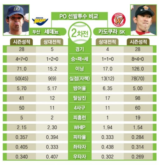 그러나 2차전은 타격전 양상으로 전개될 가능성이 크다. 양쪽 선발의 무게가 1차전에 비해 현격히 떨어지기 때문이다. 두산 세데뇨는 1차전 6회말 원포인트 릴리프로 투입돼 박정권을 볼넷으로 출루시킨 데서도 확인할 수 있듯 페넌트레이스에서는 유독 SK에 약세를 면치 못했다. SK 타자들을 상대로 WHIP(이닝당 안타와 볼넷의 허용 비율)가 2.30에다 피안타율도 0.394에 이르렀다.