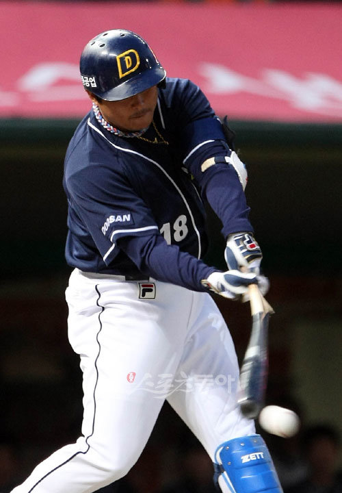 ▲ ‘두목 곰의 힘찬 스윙.’ 베어스와 가장 어울리는 외모, 그리고 주장 완장에 걸맞은 실력까지 겸비해 항상 든든한 4번 타자 김동주.