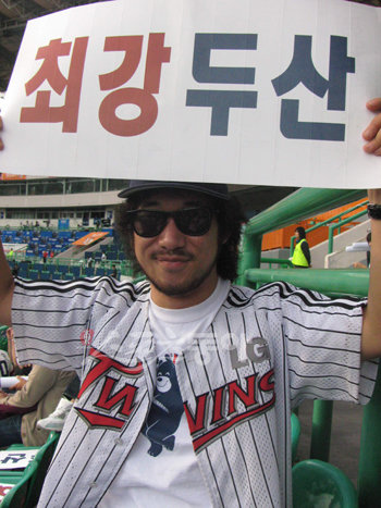 강 씨는 자타가 공인하는 열혈 LG팬. 그러나 전혀 개의치 않는다. 친구 윤경민(23) 씨와 함께 LG의 흰색 줄무늬 유니폼을 입고 경기장 3루쪽 스탠드에 자리잡고 앉았다.