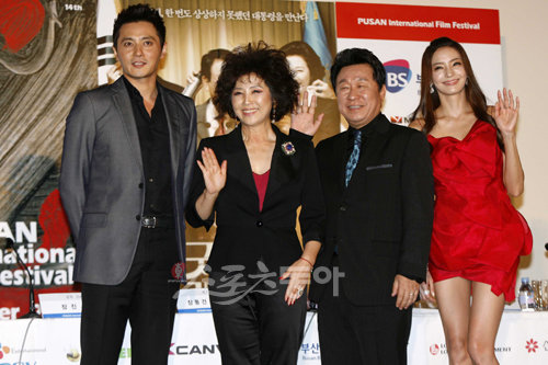 개막식에 앞서 부산 센텀시티CGV에서 열린 영화 ‘굿모닝 프레지던트’ 기자시사에 참석한 배우들. (왼쪽부터) 장동건 고두심 임하룡 한채영. 이날 행사장에는 한류스타 장동건을 찍기 위한 각국 취재진의 경쟁이 치열했다. 부산|임진환 기자 photolim@donga.com
