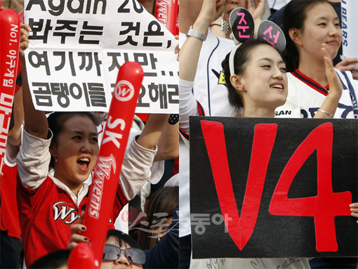 한 쪽은 울었고, 다른 한 쪽은 웃었다. 11일 잠실구장에서 열린 PO 4차전에서 2007년 2연패 뒤 4연승을 상기하는 구호를 든 SK 여성팬(왼쪽)과 4번째 우승을 기원하는 V-4 구호를 든 두산 여성팬이 팽팽한 응원전을 벌였으나 승부는 극명히 갈렸다. 잠실 | 양회성 기자 yohan@donga.com
