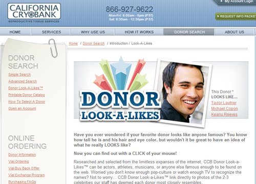 유명인을 닮은 정자 제공자를 찾을 수 있는 검색 서비스를 제공하는 미국 캘리포니아 정자은행의 홈페이지.