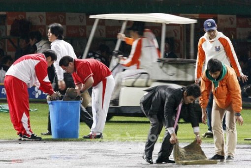 야구팬들의 큰 관심을 끈 SK와 두산의 플레이오프 5차전. 2회초 두산 김현수가 홈런을 쏘아 올린 뒤 갑자기 빗줄기가 굵어졌고, 곧바로 김동주 타석 때 초구가 들어가자 심판진은 중단을 선언했다. 이때가 오후 6시26분. 올 4월 SK가 700여만원을 들여 구입한 메이저리그식 방수포가 문학구장에 등장했지만 구단 관계자와 자원봉사자 손에 들려 나온 방수포는 제 역할을 하지 못했다. 긴급상황에서 방수포를 사용하는 요령이 부족했고, 외야 우측부터 깔린 방수포는 3루쪽에 채 다다르지 못했다. 마운드쪽에 뒤늦게 또다른 방수포를 깔았지만, 이미 그라운드에는 물이 흥건히 고인 뒤였다.
