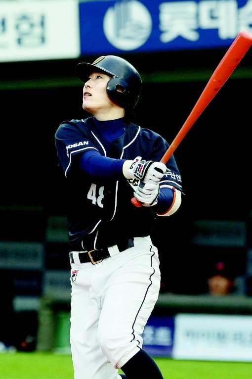 2009 프로야구 롯데자이언츠 대 두산베어스 경기가 2일 부산 사직야구장에서 열렸다. 4회초 2사 1,2루 두산 이원석이 좌월 스리런 홈런을 날리고 타구 방향을 바라보고 있다. 사직 | 김종원기자 won@donga.com