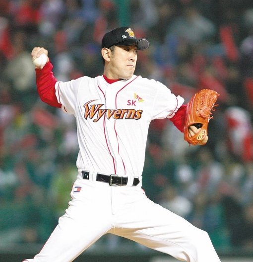 SK 용병 카도쿠라(35·사진)는 야구선수로서는 얄궂은 운명을 가지고 태어났다. 그는 프로 입단 후 무려 14년 동안 큰 경기 경험이 전무하다. 요미우리, 주니치, 긴테쓰 등 일본 유명구단을 거쳐 메이저리그(시카고 컵스)까지 진출한 꽤 잘 나가는 투수였지만 유독 일본시리즈 등 가을잔치에서 좀처럼 피칭할 기회를 잡지 못했다.