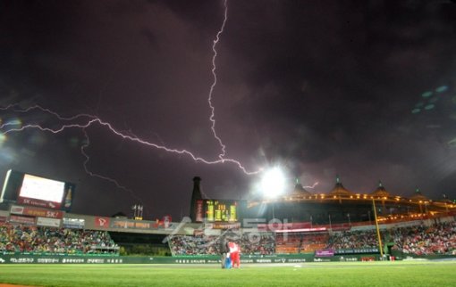 ▲ 경기장을 가득 메운 2만7000여 관중들의 애타는 마음에도 아랑곳 하지 않는다는 듯 문학구장 위로 번개가 치고 있다.