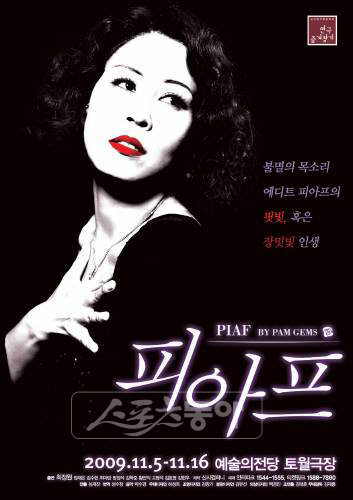 연극 ‘피아프(Piaf)’는 제목 그대로 20세기 최고의 샹송가수로 추앙받는 에디트 피아프의 일생을 그린 작품이다. 1978년 영국의 극작가 팜 젬스가 발표한 작품으로 피아프의 불우했던 어린 시절부터 인생 절정의 순간까지 그가 살았던 극적인 삶의 굴곡을 진하게 펼쳐 보인다.