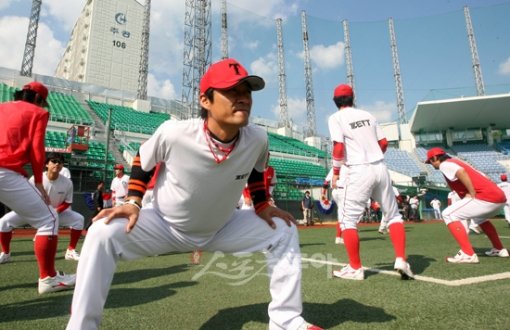 비장한 훈련 KIA 선수들이 SK와의 한국시리즈 1차전을 하루 앞둔 15일 오후 광주 무등경기장 다목적체육관에서 훈련을 하고 있다. KIA 최고참 이종범(맨 앞)이 비장한 표정으로 몸을 풀고 있다. 광주 | 박화용 기자 inphoto@donga.com