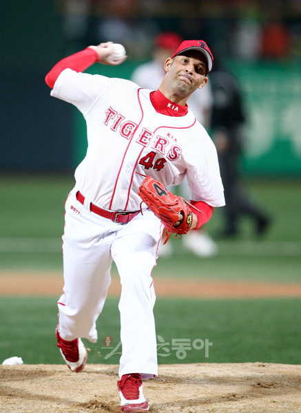 KIA 선발 로페즈(사진)가 8이닝 동안 122개의 공을 던지며 KIA의 한국시리즈 첫 승을 이끌었다. KIA 조범현 감독은 로페즈와 함께 윤석민, 구톰슨을 놓고 1차전 선발을 고민했다. 결국 최근 가장 구위가 뛰어나고 SK전에 시즌 4경기 선발로 등판해 패 없이 2승을 거두며 31.2이닝 동안 방어율 2.27로 강한 면모를 보인 로페즈에게 1차전 선발이라는 중책을 맡았다.