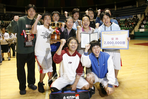 직장인 ‘농구짱’은 우리! 18일 서울 장충체육관에서 열린 제1회 IBK 기업은행장배 직장인 농구대회 결승에서 우승한 현대 모비스 선수들이 윤용로 IBK기업은행장(가운데)과 파이팅을 외치며 기뻐하고 있다.임진환 기자 photolim@dong.com