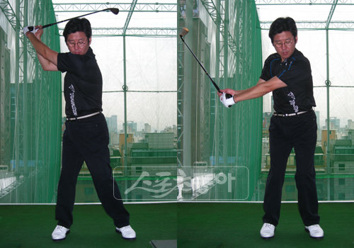 풀스윙(왼쪽)과 거리조절을 위한 하프스윙(오른쪽)은 스탠스의 폭과 스윙 크기만 달라졌을 뿐 기본적으로 동일하다. 스윙이 작아졌다고 해서 스윙 스피드나 리듬까지 흐트러져서는 안 된다. 언제나 동일한 리듬과 스피드로 볼을 정확히 때리면 일정한 거리감을 얻을 수 있다.