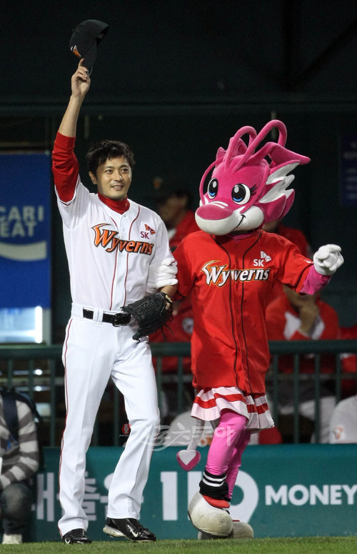 2009 프로야구 한국시리즈 6차전 SK와이번스 대 기아타이거즈 경기가 23일 잠실야구장에 열렸다. 경기 전 영화배우 장동건이 시구를 위해 마운드에 오르고 있다.