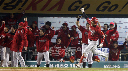 2009프로야구 한국시리즈 6차전 SK와이번스 대 KIA타이거즈의 경기가 23일 서울 잠실야구장에서 열렸다. 4회초 2사 2루서 KIA 김상현이 밀어 친 우측 파울홈런을 홈런으로 착각해 뛰어나가며 환호하고 있다.