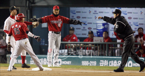 2009프로야구 한국시리즈 6차전 SK와이번스 대 KIA타이거즈의 경기가 23일 서울 잠실야구장에서 열렸다. 1회초 2사 2루 KIA 최희섭 타석 때 주자 이용규가 3루로 쇄도, 아웃되고 있다.
