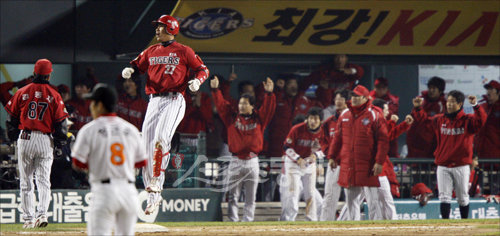 2009프로야구 한국시리즈 6차전 SK와이번스 대 KIA타이거즈의 경기가 23일 서울 잠실야구장에서 열렸다. 4회초 2사 2루서 KIA 김상현이 밀어 친 우측 홈런성 타구가 파울이 되자 펄쩍 뛰어오르며 아쉬워하고 있다.