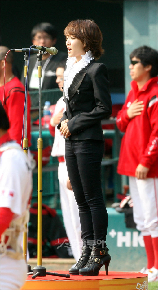 24일 서울 잠실야구장에서 열린 프로야구 SK와 KIA의 한국시리즈 7차전에서 가수 윤하가 국민의례때 애국가를 열창하고 있다.