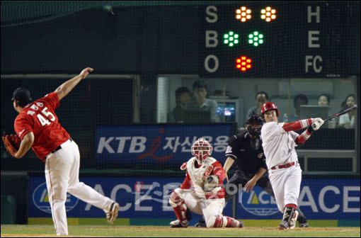 2009프로야구 한국시리즈 7차전 KIA타이거즈 대 SK와이번스의 경기가 24일 서울 잠실야구장에서 열렸다. 5:5 동점 상황 9회말 1사, KIA 나지완이 SK 마무리 투수 채병용을 상대로 결승 솔로 홈런을 날리고 있다.